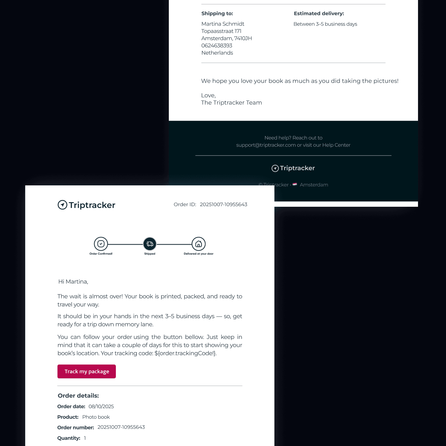As a print-on-demand e-commerce platform, one of Peecho's core functionalities is sending confirmation emails throughout the order flow. Customers receive an order confirmation when payment goes through and a shipping confirmation when the order leaves our print facilities.