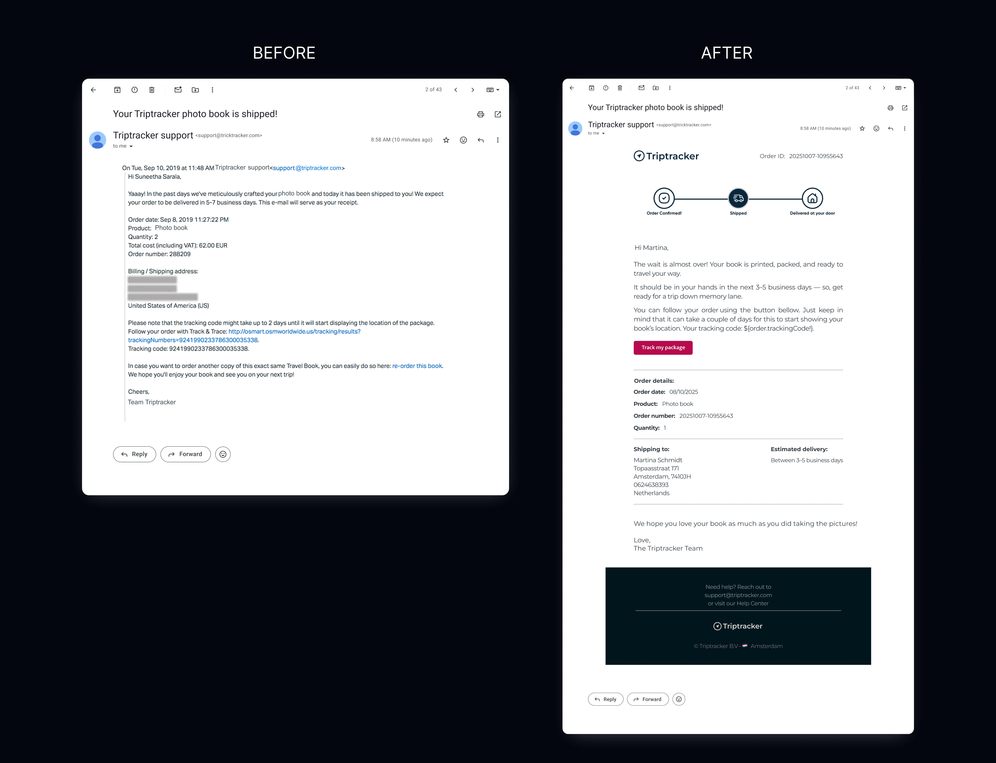 One of our larger clients uses our system to send shipping confirmations to their end-customers. However, the template was plain text only. It didn't reflect their branding or looked like a standard e-commerce shipping email, creating room for users to question their brand credibility.